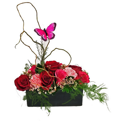 Gorgeous pauve arrangement with roses, carnations, wax flower and plimosus. Accented with curly willow and a single butterfly.